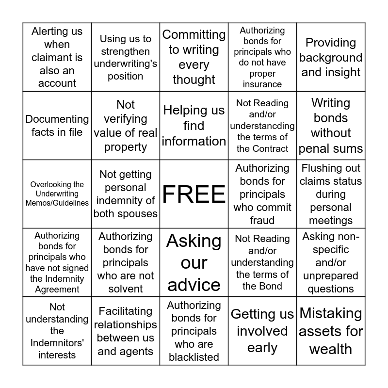 This bingo card has a free space and 26 words: Asking our advice, Getting us involved early, Helping us find information, Facilitating relationships between us and agents, Providing background and insight, Alerting us when claimant is also an account, Documenting facts in file, Using us to strengthen underwriting's position, Flushing out claims status during personal meetings, Not Reading and/or understanding the terms of the Bond, Not Reading and/or understancding the terms of the Contract, Overlooking the Underwriting Memos/Guidelines, Asking non-specific and/or unprepared questions, Not understanding the Indemnitors' interests, Not getting personal indemnity of both spouses, Bond forms that do not allow an opportunity to complete, Authorizing bonds for principals who do not have proper insurance, Authorizing bonds for principals who have not signed the Indemnity Agreement, Committing to writing every thought, Mistaking assets for wealth, Writing bonds without penal sums, Authorizing bonds for principals who are blacklisted, Authorizing bonds for principals who commit fraud, Authorizing bonds for principals who are not solvent, Not verifying value of real property and Authorizing bonds that refer to contracts which do not exist.
