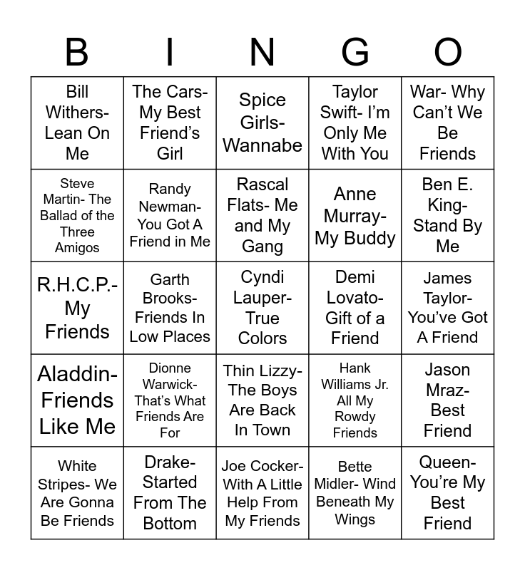 This bingo card has 29 words: White Stripes- We Are Gonna Be Friends, Theme to Friends, Garth Brooks- Friends In Low Places, Queen- You’re My Best Friend, Bill Withers- Lean On Me, Spice Girls- Wannabe, Randy Newman- You Got A Friend in Me, Dionne Warwick- That’s What Friends Are For, Demi Lovato- Gift of a Friend, Drake- Started From The Bottom, James Taylor- You’ve Got A Friend, Cyndi Lauper- True Colors, Joe Cocker- With A Little Help From My Friends, Bette Midler- Wind Beneath My Wings, Ben E. King- Stand By Me, Andrew Gold- Thank You for Being A Friend, Thin Lizzy- The Boys Are Back In Town, Aladdin- Friends Like Me, War- Why Can’t We Be Friends, R.H.C.P.- My Friends, Hank Williams Jr. All My Rowdy Friends, Less Than Jake- All My Friends Are Metal Heads, Anne Murray- My Buddy, Steve Martin- The Ballad of the Three Amigos, Taylor Swift- I’m Only Me With You, The Cars- My Best Friend’s Girl, Jason Mraz- Best Friend, Rascal Flats- Me and My Gang and Carpenters- Good Friends Are For Keeps.