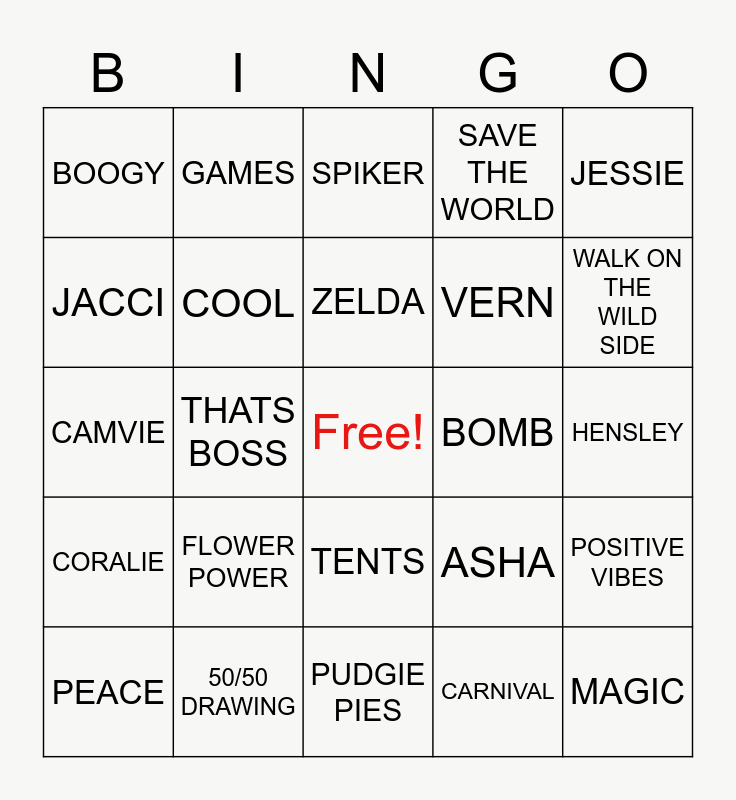 This bingo card has a free space and 94 words: CATS, SMORES, PUDGIE PIES, STRAW BERRY HILL, WOOD STOCK, CAMP FIRE, BAND, PEACE, LOVE, FOOD, FRIENDS, FUN, COVID, VERN, ALMA, JESSIE, SPIKER, MARILYN, LUCY, BINGO, GUITAR, DRUMS, CORN HOLE, VW CAT BUG, FLOWER POWER, COOL, DMAN, COTTON CANDY, POPCORN, GROOVY, 50/50 DRAWING, TENTS, TRIVIA, STORIES, GAMES, MUSIC, HIPPIE, PANIA, ZELDA, ASHA, CAMVIE, CORALIE, HENSLEY, KIARA, MAGIC, NYOTA, RAMSAY, WALTER, MASKS, HOT DOGS, BALLOONS, CARNIVAL, CHALK FUN, PEACHY KEEN, RADICAL, FREAK OUT, WAVY GRAVY, CAN YOU DIG IT, FREE LOVE, CATCH SOME RAYS, THATS BOSS, PASSION PIT, HANG TOUGH, HEY YO, SANDALS, COVIES, PORCHIES, BARNIES, JACCI, BELL BOTTOMS, HEAD BANDS, KNEE HIGH BOOTS, CHAINS, MOCCASINS, SAVE THE WORLD, RAISE A HIPPIE, GOOD GIRL, BAD HABITS, WALK ON THE WILD SIDE, POSITIVE VIBES, LIVE AND LET DIE, PEACE OUT, FAR OUT MAN, CHILLAXIN, BOMB, BOOGY, CASANOVA, ARE YOU DECENT?, NIFTY, JEEPERS CREEPERS, OFF THE HOOK, OUTTA SIGHT, RIGHT ON, BOOK IT and CATCH MY DRIFT.