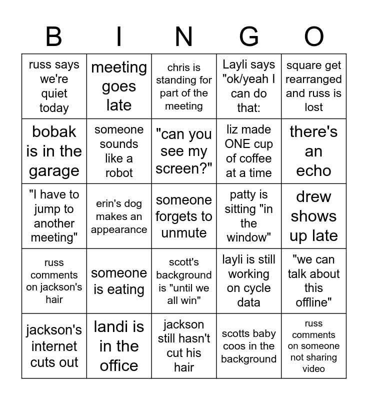 This bingo card has 25 words: russ comments on jackson's hair, landi is in the office, someone forgets to unmute, scotts baby coos in the background, square get rearranged and russ is lost, russ says we're quiet today, meeting goes late, chris is standing for part of the meeting, patty is sitting "in the window", "we can talk about this offline", bobak is in the garage, someone sounds like a robot, jackson still hasn't cut his hair, layli is still working on cycle data, there's an echo, jackson's internet cuts out, erin's dog makes an appearance, "can you see my screen?", liz made ONE cup of coffee at a time, drew shows up late, "I have to jump to another meeting", someone is eating, scott's background is "until we all win", Layli says "ok/yeah I can do that: and russ comments on someone not sharing video.