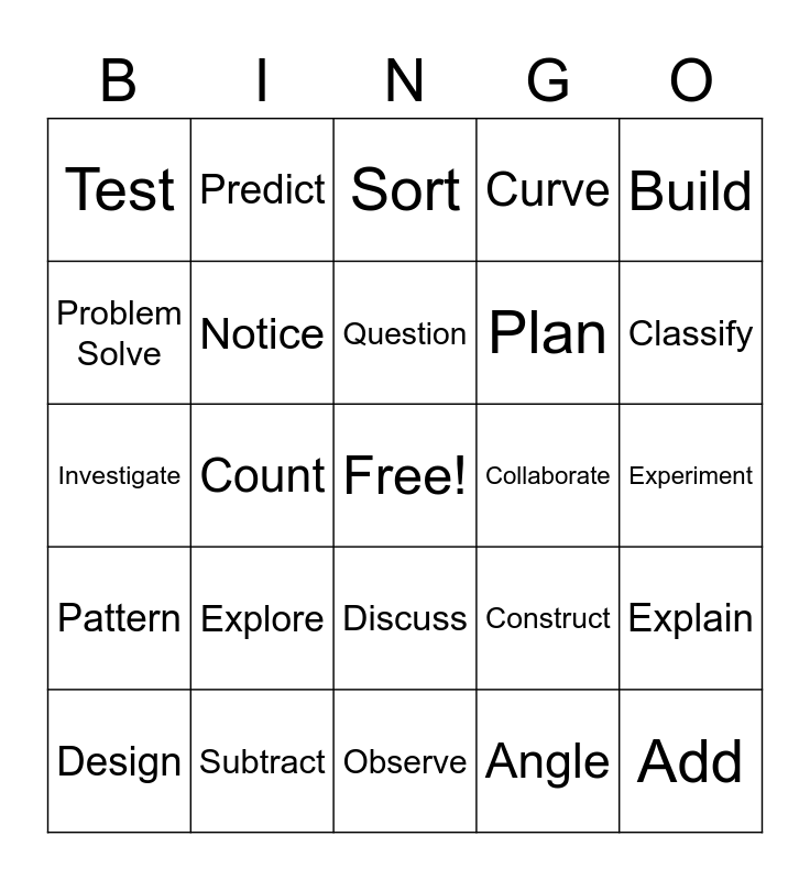 This bingo card has a free space and 25 words: Explore, Observe, Question, Design, Build, Test, Problem Solve, Predict, Collaborate, Discuss, Plan, Investigate, Construct, Explain, Notice, Compare, Experiment, Sort, Classify, Count, Add, Subtract, Pattern, Curve and Angle.