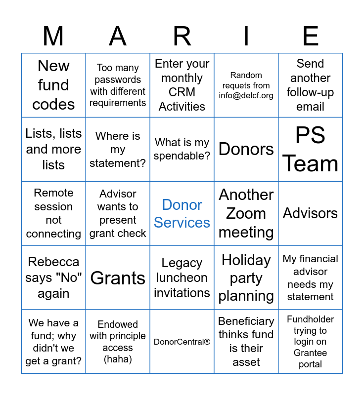 This bingo card has a free space and 35 words: Fundholder forgets password AGAIN, Grant purpose: nephew's tuition, NPO confused by second fund, Where is my statement?, Legacy luncheon invitations, Random requets from info@delcf.org, Lists, lists and more lists, NPO wants to close endowment, What is my spendable?, I want to start a nonprofit, Remote session not connecting, Send another follow-up email, What is my balance?, FIMS login error, New fund codes, Another Zoom meeting, Beneficiary thinks fund is their asset, Advisor wants to present grant check, Rebecca says "No" again, Fundholder trying to login on Grantee portal, Holiday party planning, We have a fund; why didn't we get a grant?, My financial advisor needs my statement, Endowed with principle access (haha), Enter your monthly CRM Activities, PS Team, What the heck is a QCD?, Donations, Donors, Advisors, Events, DonorCentral®, Grants, Too many passwords with different requirements and I want to grant more than my spendable.