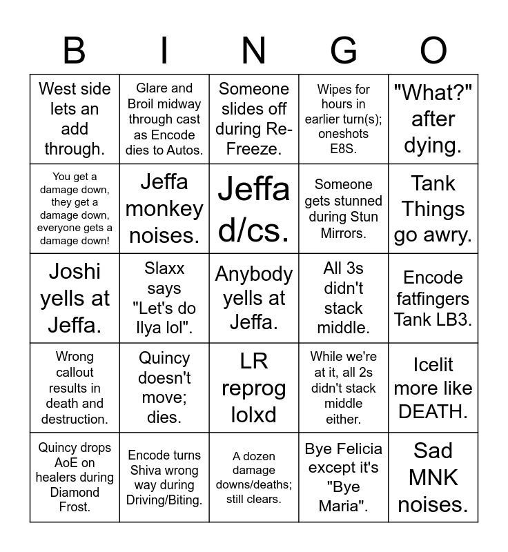 This bingo card has a free space and 24 words: Quincy doesn't move; dies., Encode turns Shiva wrong way during Driving/Biting., Jeffa d/cs., Quincy drops AoE on healers during Diamond Frost., "What?" after dying., West side lets an add through., You get a damage down, they get a damage down, everyone gets a damage down!, Glare and Broil midway through cast as Encode dies to Autos., All 3s didn't stack middle., LR reprog lolxd, Someone gets stunned during Stun Mirrors., Joshi yells at Jeffa., While we're at it, all 2s didn't stack middle either., Icelit more like DEATH., Jeffa monkey noises., Bye Felicia except it's "Bye Maria"., Encode fatfingers Tank LB3., Someone slides off during Re-Freeze., Tank Things go awry., Slaxx says "Let's do Ilya lol"., Sad MNK noises., Wrong callout results in death and destruction., Wipes for hours in earlier turn(s); oneshots E8S. and A dozen damage downs/deaths; still clears..