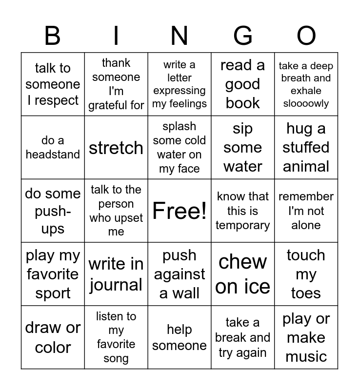 This bingo card has a free space and 24 words: write in journal, listen to my favorite song, splash some cold water on my face, draw or color, take a deep breath and exhale sloooowly, talk to someone I respect, do a headstand, thank someone I'm grateful for, know that this is temporary, push against a wall, sip some water, do some push-ups, chew on ice, touch my toes, stretch, take a break and try again, remember I'm not alone, write a letter expressing my feelings, hug a stuffed animal, talk to the person who upset me, play or make music, play my favorite sport, read a good book and help someone.