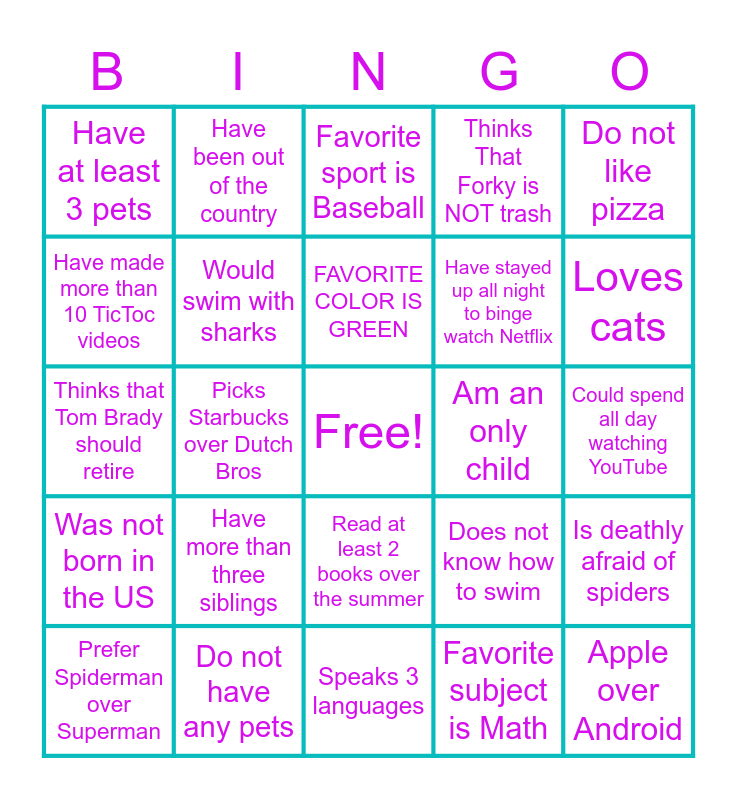 This bingo card has a free space and 24 words: Have more than three siblings, Do not have any pets, FAVORITE COLOR IS GREEN, Prefer Spiderman over Superman, Do not like pizza, Have at least 3 pets, Have made more than 10 TicToc videos, Have been out of the country, Am an only child, Read at least 2 books over the summer, Have stayed up all night to binge watch Netflix, Thinks that Tom Brady should retire, Does not know how to swim, Is deathly afraid of spiders, Would swim with sharks, Favorite subject is Math, Could spend all day watching YouTube, Favorite sport is Baseball, Loves cats, Picks Starbucks over Dutch Bros, Apple over Android, Was not born in the US, Thinks That Forky is NOT trash and Speaks 3 languages.