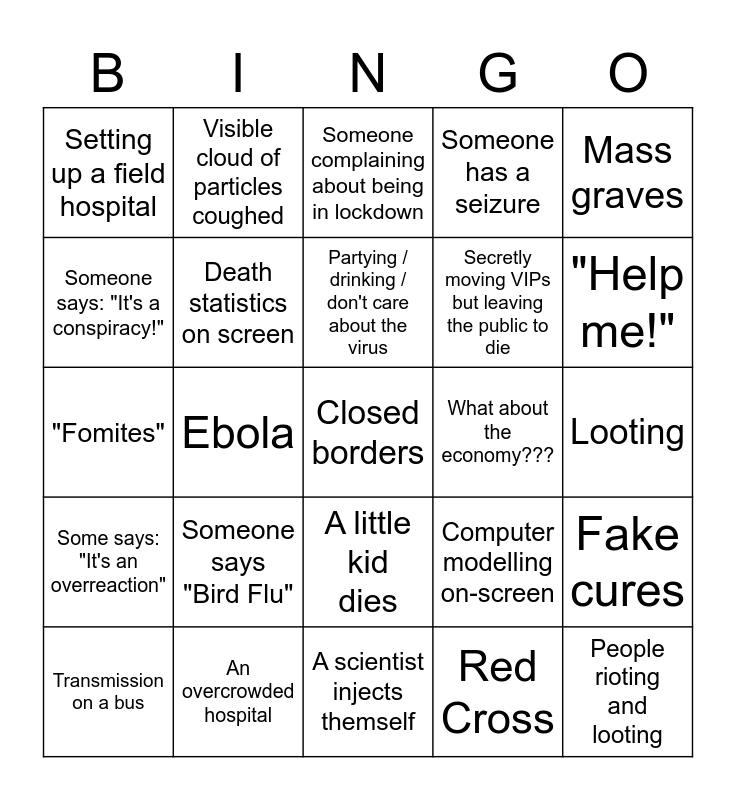 This bingo card has 25 words: Someone says "Bird Flu", A scientist injects themself, Partying / drinking / don't care about the virus, Transmission on a bus, Mass graves, Setting up a field hospital, Someone says: "It's a conspiracy!", Visible cloud of particles coughed, What about the economy???, A little kid dies, Secretly moving VIPs but leaving the public to die, "Fomites", Computer modelling on-screen, Fake cures, Death statistics on screen, People rioting and looting, Looting, Someone complaining about being in lockdown, "Help me!", Ebola, Closed borders, An overcrowded hospital, Some says: "It's an overreaction", Someone has a seizure and Red Cross.