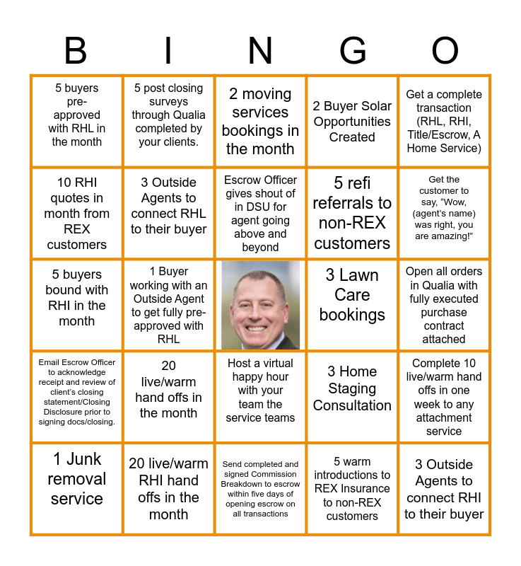 This bingo card has a free space and 24 words: 20 live/warm hand offs in the month, 20 live/warm RHI hand offs in the month, Escrow Officer gives shout of in DSU for agent going above and beyond, 1 Junk removal service, Get a complete transaction (RHL, RHI, Title/Escrow, A Home Service), 5 buyers pre-approved with RHL in the month, 10 RHI quotes in month from REX customers, 5 post closing surveys through Qualia completed by your clients., 3 Lawn Care bookings, Host a virtual happy hour with your team the service teams, 5 refi referrals to non-REX customers, 5 buyers bound with RHI in the month, 3 Home Staging Consultation, Complete 10 live/warm hand offs in one week to any attachment service, 3 Outside Agents to connect RHL to their buyer, 5 warm introductions to REX Insurance to non-REX customers, Open all orders in Qualia with fully executed purchase contract attached, 2 moving services bookings in the month, Get the customer to say, “Wow, (agent’s name) was right, you are amazing!”, 1 Buyer working with an Outside Agent to get fully pre-approved with RHL, 3 Outside Agents to connect RHI to their buyer, Email Escrow Officer to acknowledge receipt and review of client’s closing statement/Closing Disclosure prior to signing docs/closing., 2 Buyer Solar Opportunities Created and Send completed and signed Commission Breakdown to escrow within five days of opening escrow on all transactions.