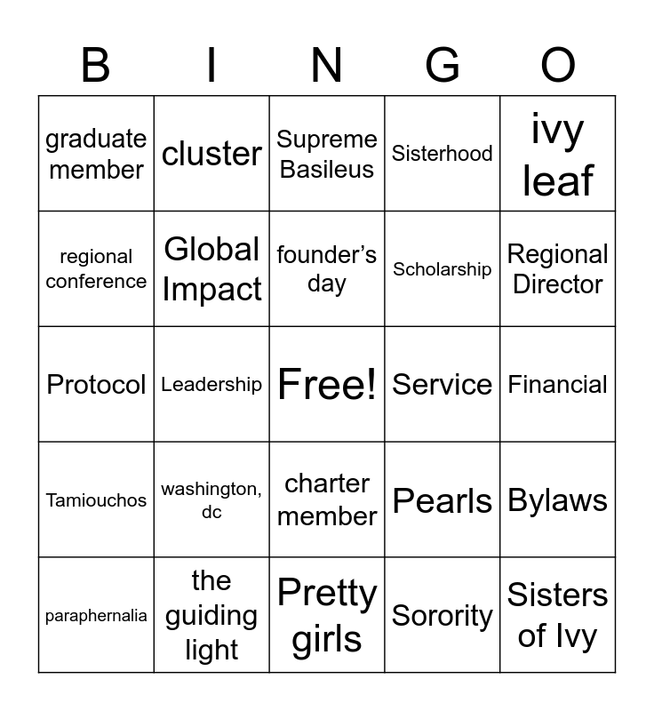This bingo card has a free space and 24 words: washington, dc, the guiding light, founder’s day, paraphernalia, ivy leaf, graduate member, regional conference, cluster, Service, charter member, Scholarship, Protocol, Pearls, Bylaws, Global Impact, Sorority, Financial, Supreme Basileus, Regional Director, Leadership, Sisters of Ivy, Tamiouchos, Sisterhood and Pretty girls.