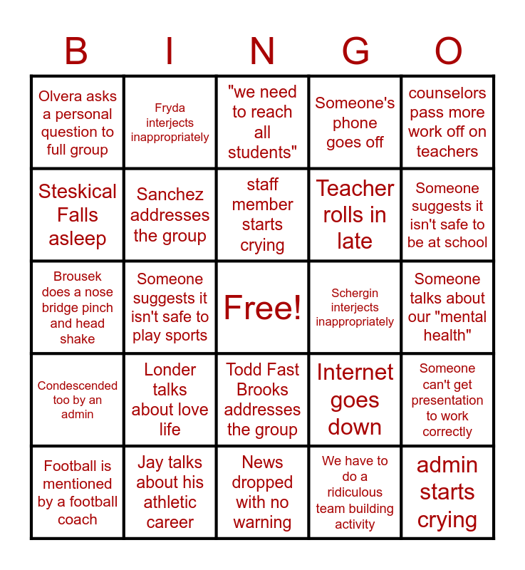 This bingo card has a free space and 24 words: Londer talks about love life, Jay talks about his athletic career, staff member starts crying, Football is mentioned by a football coach, counselors pass more work off on teachers, Olvera asks a personal question to full group, Steskical Falls asleep, Fryda interjects inappropriately, Schergin interjects inappropriately, Todd Fast Brooks addresses the group, Teacher rolls in late, Brousek does a nose bridge pinch and head shake, Internet goes down, Someone can't get presentation to work correctly, Sanchez addresses the group, We have to do a ridiculous team building activity, Someone talks about our "mental health", "we need to reach all students", Someone suggests it isn't safe to be at school, Someone suggests it isn't safe to play sports, admin starts crying, Condescended too by an admin, Someone's phone goes off and News dropped with no warning.