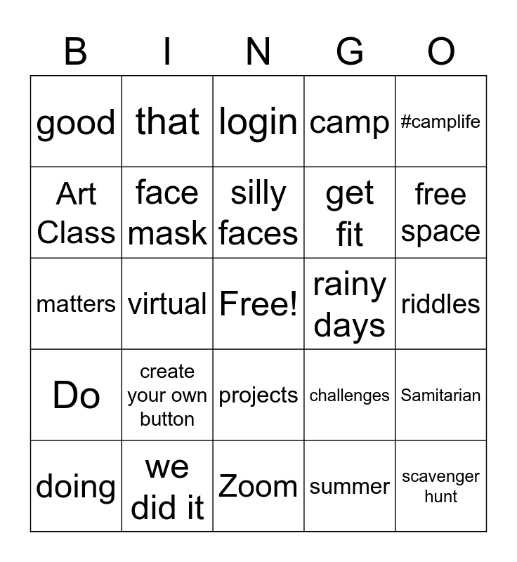 This bingo card has a free space and 24 words: doing, create your own button, silly faces, summer, #camplife, good, that, login, rainy days, riddles, matters, face mask, challenges, Samitarian, Art Class, we did it, Zoom, camp, free space, Do, virtual, projects, get fit and scavenger hunt.