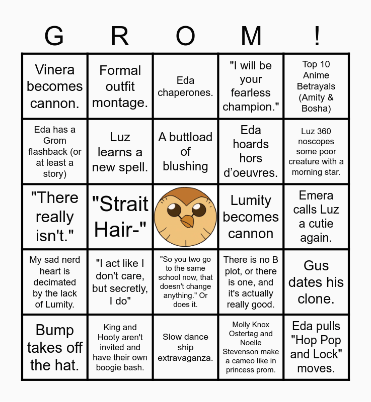 This bingo card has a free space and 24 words: "I act like I don't care, but secretly, I do", King and Hooty aren't invited and have their own boogie bash., A buttload of blushing, Bump takes off the hat., Top 10 Anime Betrayals (Amity & Bosha), Vinera becomes cannon., Eda has a Grom flashback (or at least a story), Formal outfit montage., Lumity becomes cannon, "So you two go to the same school now, that doesn't change anything." Or does it., Eda hoards hors d’oeuvres., "There really isn't.", There is no B plot, or there is one, and it's actually really good., Gus dates his clone., Luz learns a new spell., Molly Knox Ostertag and Noelle Stevenson make a cameo like in princess prom., Emera calls Luz a cutie again., Eda chaperones., Luz 360 noscopes some poor creature with a morning star., "Strait Hair-", Eda pulls "Hop Pop and Lock" moves., My sad nerd heart is decimated by the lack of Lumity., "I will be your fearless champion." and Slow dance ship extravaganza..