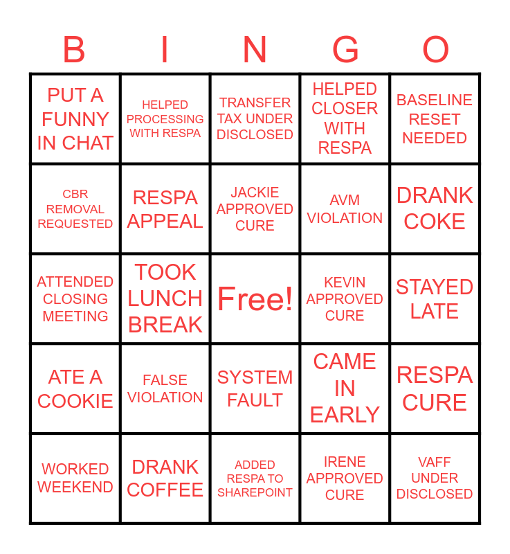 This bingo card has a free space and 24 words: FALSE VIOLATION, DRANK COFFEE, JACKIE APPROVED CURE, WORKED WEEKEND, BASELINE RESET NEEDED, PUT A FUNNY IN CHAT, CBR REMOVAL REQUESTED, HELPED PROCESSING WITH RESPA, KEVIN APPROVED CURE, SYSTEM FAULT, AVM VIOLATION, ATTENDED CLOSING MEETING, CAME IN EARLY, RESPA CURE, RESPA APPEAL, IRENE APPROVED CURE, STAYED LATE, TRANSFER TAX UNDER DISCLOSED, DRANK COKE, TOOK LUNCH BREAK, VAFF UNDER DISCLOSED, ATE A COOKIE, HELPED CLOSER WITH RESPA and ADDED RESPA TO SHAREPOINT.