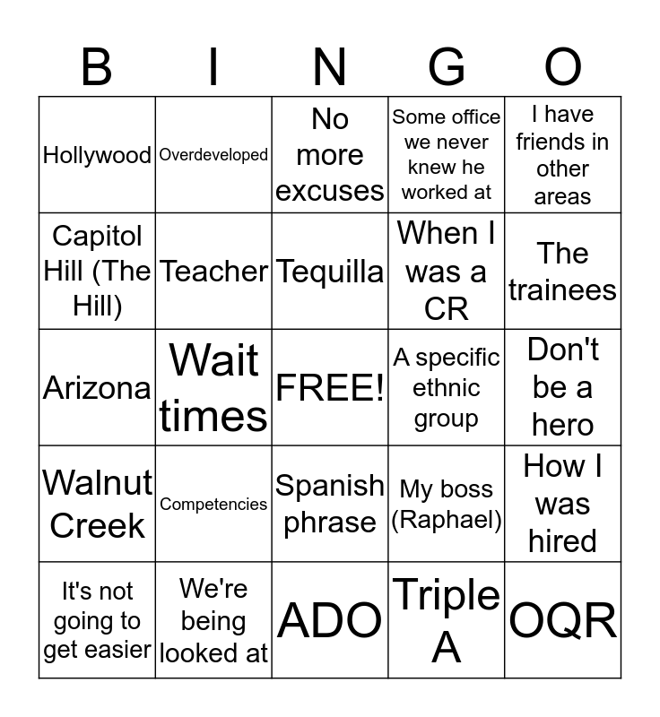 This bingo card has a free space and 24 words: Competencies, We're being looked at, Tequilla, It's not going to get easier, I have friends in other areas, Hollywood, Capitol Hill (The Hill), Overdeveloped, A specific ethnic group, Spanish phrase, When I was a CR, Arizona, My boss (Raphael), How I was hired, Teacher, Triple A, Don't be a hero, No more excuses, The trainees, Wait times, OQR, Walnut Creek, Some office we never knew he worked at and ADO.
