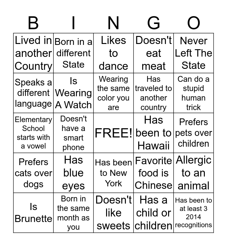 This bingo card has a free space and 24 words: Has blue eyes, Born in the same month as you, Wearing the same color you are, Is Brunette, Never Left The State, Lived in another Country, Speaks a different language, Born in a different State, Has been to Hawaii, Has been to New York, Has traveled to another country, Elementary School starts with a vowel, Favorite food is Chinese, Allergic to an animal, Is Wearing A Watch, Has a child or children, Prefers pets over children, Likes to dance, Can do a stupid human trick, Doesn't have a smart phone, Has been to at least 3 2014 recognitions, Prefers cats over dogs, Doesn't eat meat and Doesn't like sweets.