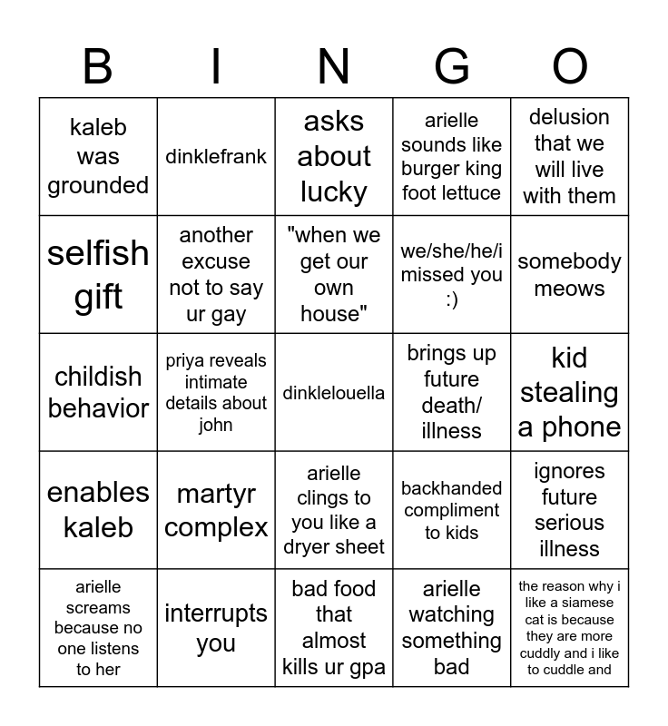 This bingo card has a free space and 24 words: martyr complex, interrupts you, "when we get our own house", arielle screams because no one listens to her, delusion that we will live with them, kaleb was grounded, selfish gift, dinklefrank, brings up future death/ illness, arielle clings to you like a dryer sheet, we/she/he/i missed you :), childish behavior, backhanded compliment to kids, ignores future serious illness, another excuse not to say ur gay, arielle watching something bad, kid stealing a phone, asks about lucky, somebody meows, priya reveals intimate details about john, the reason why i like a siamese cat is because they are more cuddly and i like to cuddle and, enables kaleb, arielle sounds like burger king foot lettuce and bad food that almost kills ur gpa.