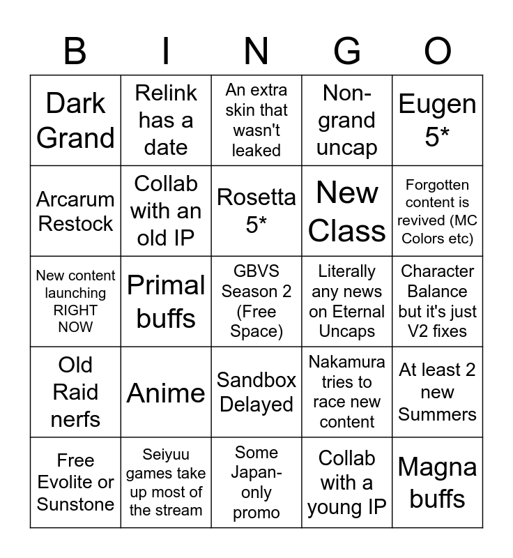 This bingo card has a free space and 24 words: Anime, Seiyuu games take up most of the stream, Rosetta 5*, Free Evolite or Sunstone, Eugen 5*, Dark Grand, Arcarum Restock, Relink has a date, Literally any news on Eternal Uncaps, Sandbox Delayed, New Class, New content launching RIGHT NOW, Nakamura tries to race new content, At least 2 new Summers, Collab with an old IP, Collab with a young IP, Character Balance but it's just V2 fixes, An extra skin that wasn't leaked, Forgotten content is revived (MC Colors etc), Primal buffs, Magna buffs, Old Raid nerfs, Non-grand uncap and Some Japan-only promo.