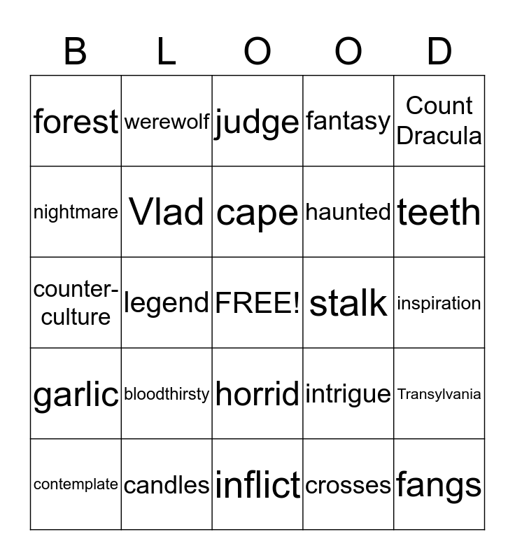 This bingo card has a free space and 24 words: bloodthirsty, candles, cape, contemplate, Count Dracula, forest, nightmare, werewolf, stalk, horrid, haunted, counter- culture, intrigue, Transylvania, Vlad, crosses, inspiration, judge, teeth, legend, fangs, garlic, fantasy and inflict.