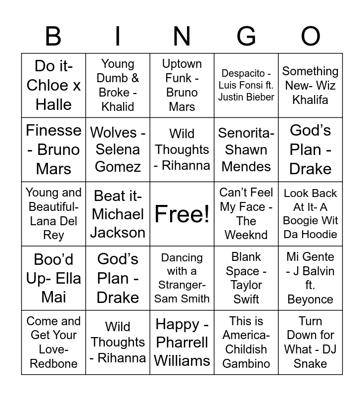 ⚠ This card has duplicate items: Happy - Pharrell Williams (2), God’s Plan - Drake (2), Havana - Camila Cabello (2), Young Dumb & Broke - Khalid (2), Despacito - Luis Fonsi ft. Justin Bieber (2), Finesse - Bruno Mars (2), Mi Gente - J Balvin ft. Beyonce (2), One Dance - Drake (2), Uptown Funk - Bruno Mars (2), Wild Thoughts - Rihanna (2), Can’t Feel My Face - The Weeknd (2), Something New- Wiz Khalifa (2), Beat it- Michael Jackson (2), This is America- Childish Gambino (2), Look Back At It- A Boogie Wit Da Hoodie (2), Boo’d Up- Ella Mai (2)
