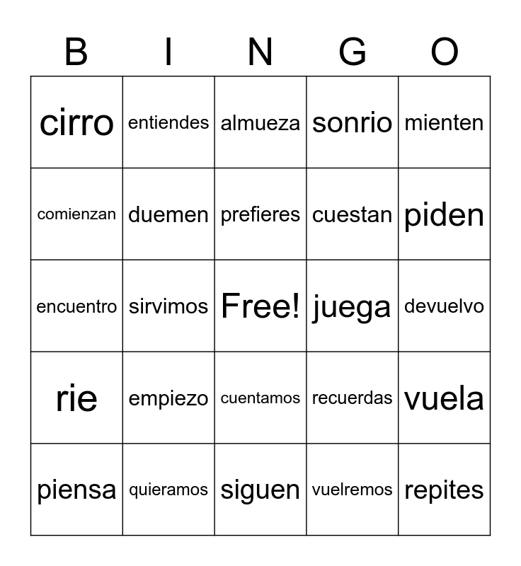 This bingo card has a free space and 24 words: empiezo, quieramos, prefieres, piensa, mienten, cirro, comienzan, entiendes, juega, cuentamos, cuestan, encuentro, recuerdas, vuela, duemen, vuelremos, devuelvo, almueza, piden, sirvimos, repites, rie, sonrio and siguen.