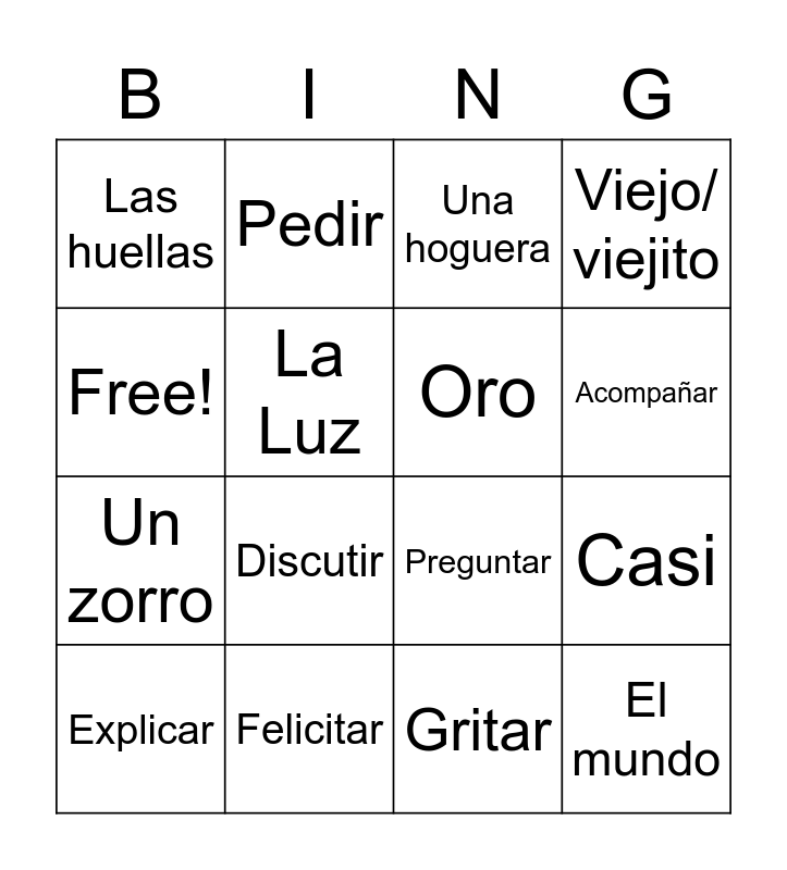 This bingo card has 20 words: Casi, Echarse, Una hoguera, Costar, Explicar, Free!, Felicitar, Las huellas, Un zorro, Pedir, Discutir, Preguntar, La Luz, El mundo, Oro, Contestar, Acompañar, Viejo/ viejito, Gritar and Los cuerpos celestiales.