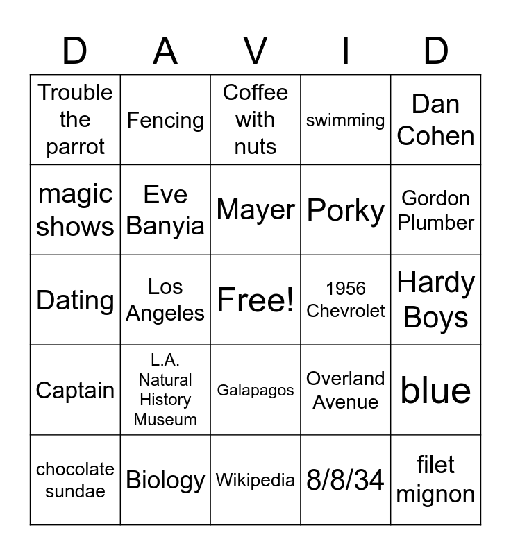 This bingo card has a free space and 36 words: Medical School, 10271 Monte Mar Drive, new book, Eve Banyia, Overland Avenue, Captain, Mayer, Psychology, Dan Cohen, Organic chemistry, Los Angeles, swimming, Barton Farm School, 1956 Chevrolet, Gordon Plumber, Trouble the parrot, Lady with a veil, L.A. Natural History Museum, filet mignon, Coffee with nuts, Hardy Boys, blue, Biology, chocolate sundae, Wikipedia, Fencing, Dating, Pomona, Porky, magic shows, Robin Hood, bicycle demo, 8/8/34, Galapagos, 50 yard freestyle and 86.