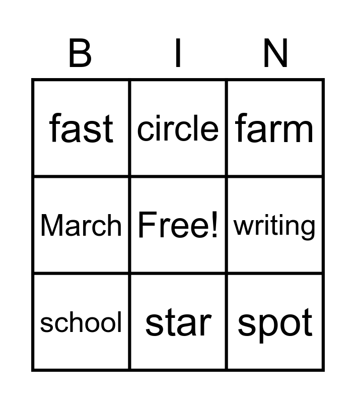 This bingo card has a free space and 21 words: cents, face, circle, fix, stress, school, fast, farm, shark, star, are, March, spotting, scrap, writing, splash, rap, print, spot, wrong and spring.