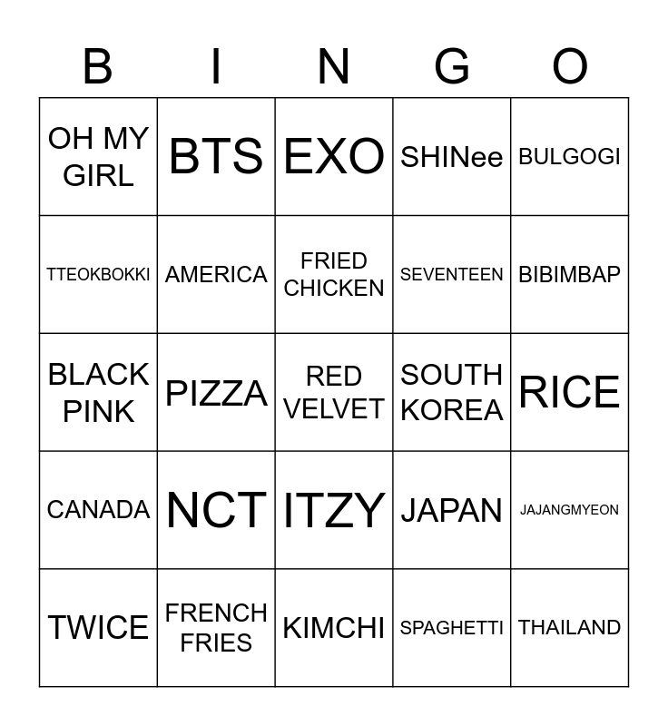 This bingo card has 25 words: NCT, KIMCHI, FRIED CHICKEN, TWICE, BULGOGI, OH MY GIRL, TTEOKBOKKI, BTS, SOUTH KOREA, ITZY, SEVENTEEN, BLACK PINK, JAPAN, JAJANGMYEON, AMERICA, THAILAND, RICE, EXO, BIBIMBAP, PIZZA, RED VELVET, FRENCH FRIES, CANADA, SHINee and SPAGHETTI.