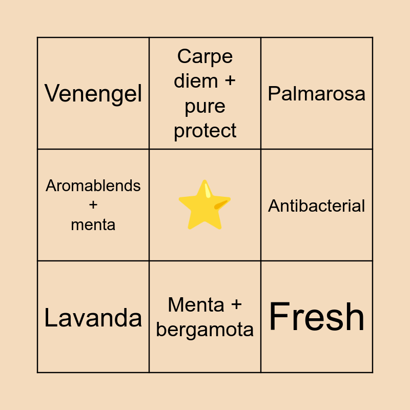 This bingo card has a free space and 11 words: Oral care, Menta + bergamota, Fresh, Lavanda, Carpe diem + pure protect, Palmarosa, Antibacterial, Menta + naranja, Aromablends + menta, Venengel and Eucasol.