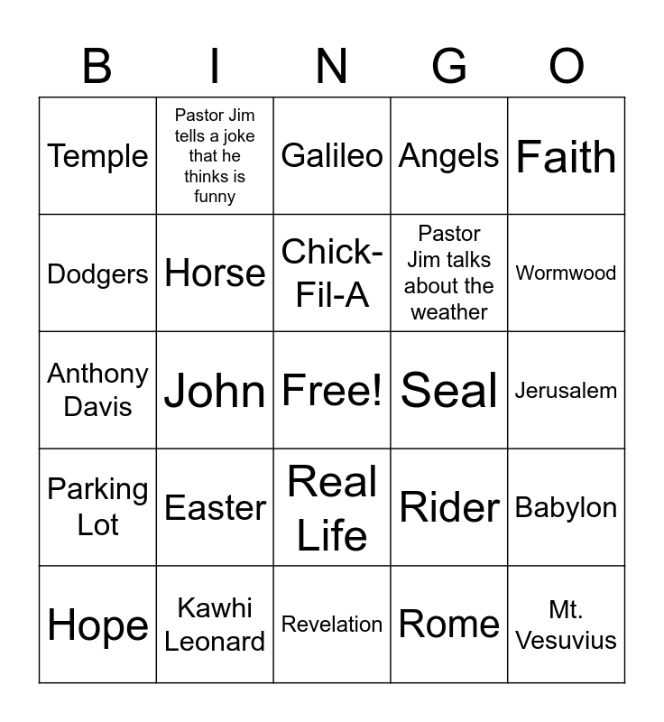 This bingo card has a free space and 31 words: Revelation, Emperor, John, Rah Rah Roman gods, Temple, Galileo, Horse, Rider, Seal, Rome, Jerusalem, Mt. Vesuvius, Pompeii, Volcanalia, Wormwood, Red Sea, Babylon, Easter, Parking Lot, Real Life, Faith, Love, Hope, Pastor Jim tells a joke that he thinks is funny, Pastor Jim talks about the weather, Dodgers, Angels, Anthony Davis, Kawhi Leonard, Chick-Fil-A and Prison.