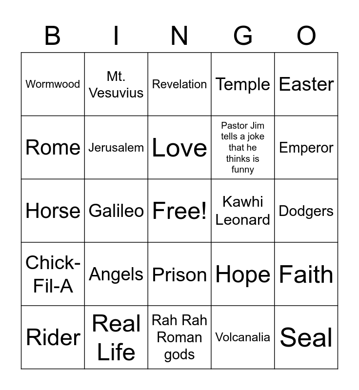 This bingo card has a free space and 31 words: Rah Rah Roman gods, Pompeii, Galileo, Babylon, Wormwood, Revelation, Jerusalem, Hope, Kawhi Leonard, Volcanalia, Dodgers, Seal, Parking Lot, John, Emperor, Pastor Jim talks about the weather, Faith, Angels, Chick-Fil-A, Prison, Easter, Anthony Davis, Rider, Mt. Vesuvius, Pastor Jim tells a joke that he thinks is funny, Rome, Temple, Horse, Real Life, Love and Red Sea.