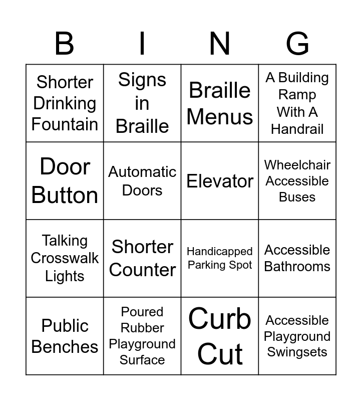 This bingo card has 16 words: Poured Rubber Playground Surface, Accessible Bathrooms, Braille Menus, Shorter Drinking Fountain, Talking Crosswalk Lights, Signs in Braille, Handicapped Parking Spot, Curb Cut, Door Button, Automatic Doors, Public Benches, A Building Ramp With A Handrail, Shorter Counter, Wheelchair Accessible Buses, Elevator and Accessible Playground Swingsets.