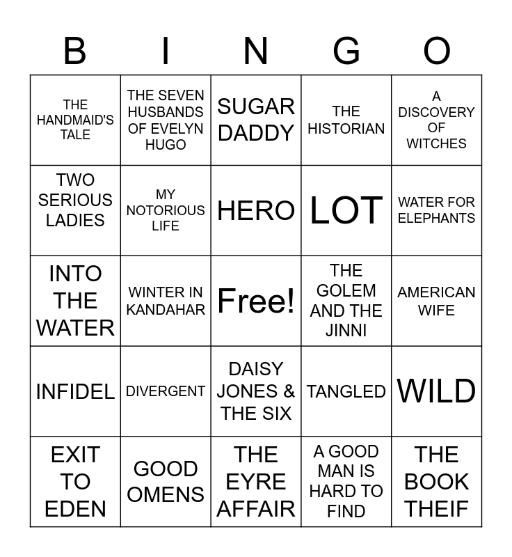 This bingo card has a free space and 24 words: DIVERGENT, GOOD OMENS, HERO, EXIT TO EDEN, A DISCOVERY OF WITCHES, THE HANDMAID'S TALE, TWO SERIOUS LADIES, THE SEVEN HUSBANDS OF EVELYN HUGO, THE GOLEM AND THE JINNI, DAISY JONES & THE SIX, LOT, INTO THE WATER, TANGLED, WILD, MY NOTORIOUS LIFE, A GOOD MAN IS HARD TO FIND, AMERICAN WIFE, SUGAR DADDY, WATER FOR ELEPHANTS, WINTER IN KANDAHAR, THE BOOK THEIF, INFIDEL, THE HISTORIAN and THE EYRE AFFAIR.