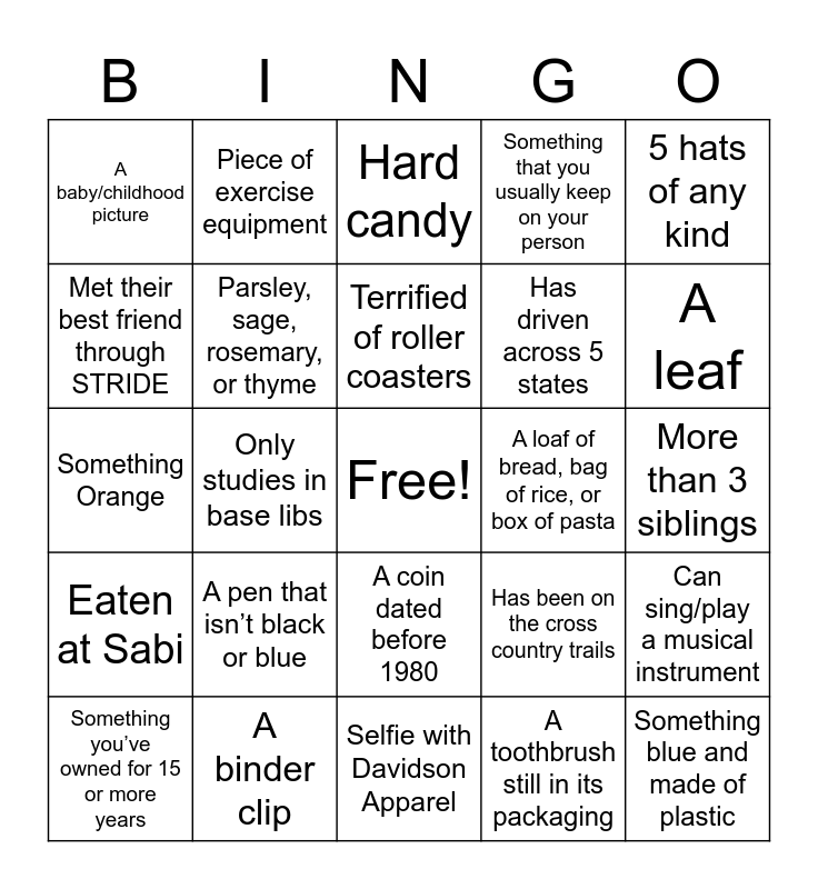 This bingo card has a free space and 45 words: A book that starts with “B”, Something blue and made of plastic, A potted plant, Something you’ve owned for 15 or more years, Shoes you would wear in water, A toothbrush still in its packaging, Hard candy, Musical Instrument, 5 hats of any kind, A binder clip, Something that you usually keep on your person, A loaf of bread, bag of rice, or box of pasta, A coin dated before 1980, A pen that isn’t black or blue, A pet (an appearance must be made to the whole group), Selfie with Davidson Apparel, A book over 1000 pages long, Something Orange, Piece of artwork, A leaf, Piece of exercise equipment, Something that weighs more than 25 pounds, Parsley, sage, rosemary, or thyme, A baby/childhood picture, Lived in Hotel Sentelle, More than 3 siblings, Pulled multiple all nighter in libs, Prefers the mountains to the beach, Has been on the cross country trails, Eaten at Sabi, Been late on the first day of classes, Can sing/play a musical instrument, Knows what STRIDE stands for, Commons > Union, Been in a theatre/musical production at Davidson, Only studies in base libs, Sent a Meme to a STRIDE group chat, Been to the Davidson Community Garden, Lined up for Commonsgiving, Terrified of roller coasters, Met their best friend through STRIDE, Has driven across 5 states, Something that weighs more than 25 pounds, Parsley, sage, rosemary, or thyme and Something with an animal on it (or an animal).