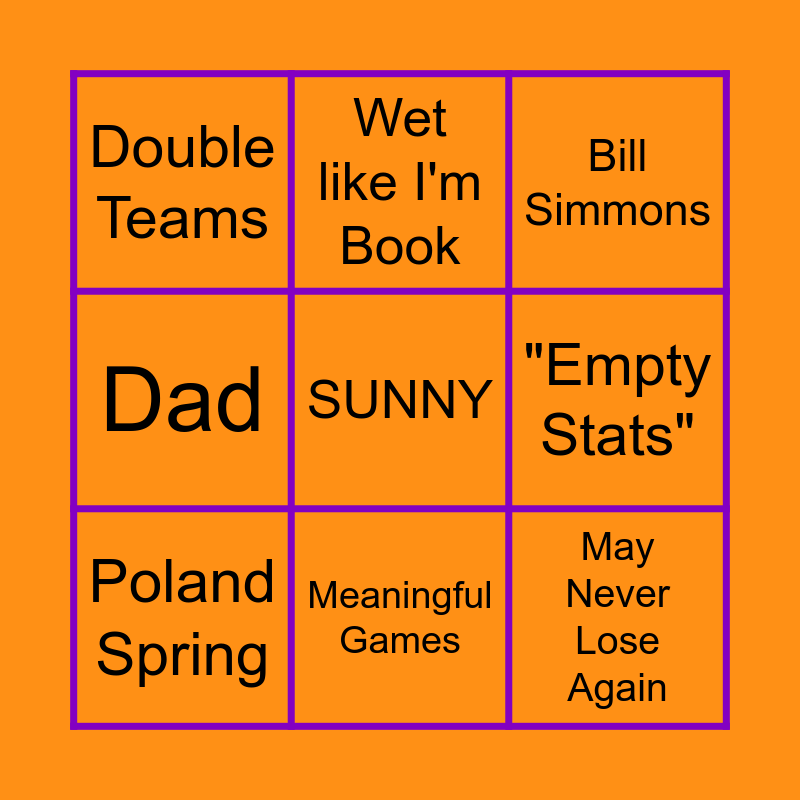 This bingo card has a free space and 8 words: "Empty Stats", Bill Simmons, Wet like I'm Book, Poland Spring, Double Teams, May Never Lose Again, Dad and Meaningful Games.