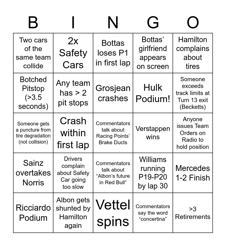 This bingo card has 25 words: Drivers complain about Safety Car going too slow, Vettel spins, Grosjean crashes, Ricciardo Podium, Hamilton complains about tires, Two cars of the same team collide, Botched Pitstop (>3.5 seconds), 2x Safety Cars, Verstappen wins, Commentators talk about “Albon’s future in Red Bull”, Hulk Podium!, Someone gets a puncture from tire degradation (not collision), Williams running P19-P20 by lap 30, Mercedes 1-2 Finish, Any team has > 2 pit stops, >3 Retirements, Anyone issues Team Orders on Radio to hold position, Bottas loses P1 in first lap, Someone exceeds track limits at Turn 13 exit (Becketts), Crash within first lap, Commentators talk about Racing Points’ Brake Ducts, Albon gets shunted by Hamilton again, Sainz overtakes Norris, Bottas’ girlfriend appears on screen and Commentators say the word “concertina”.