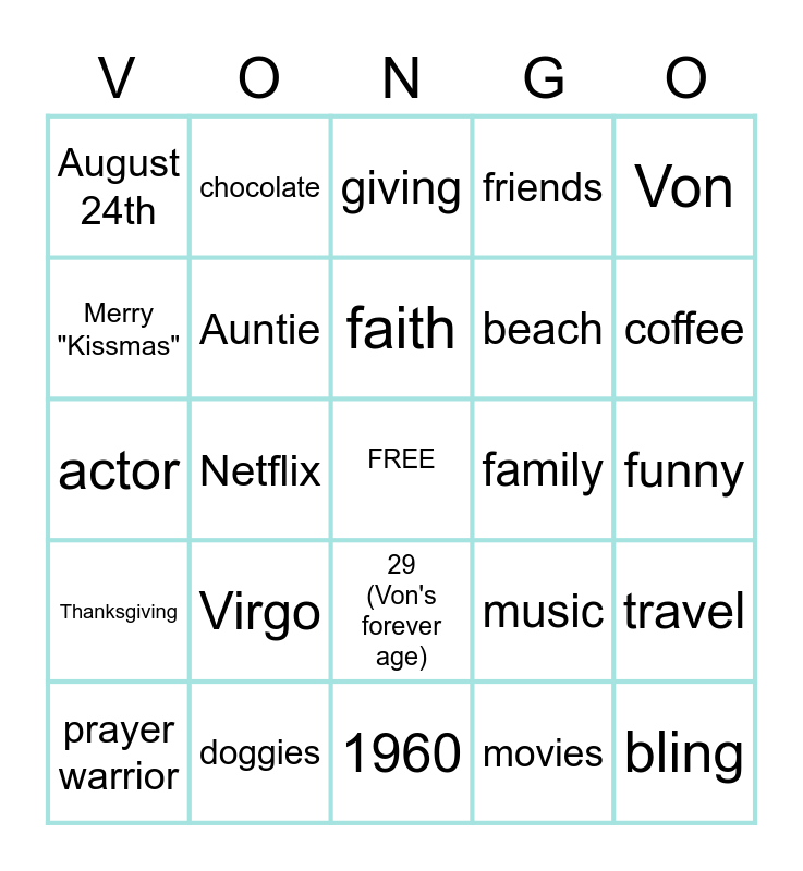 This bingo card has a free space and 24 words: Virgo, doggies, faith, prayer warrior, Von, August 24th, Merry "Kissmas", chocolate, family, 29 (Von's forever age), beach, actor, music, travel, Auntie, movies, funny, giving, coffee, Netflix, bling, Thanksgiving, friends and 1960.