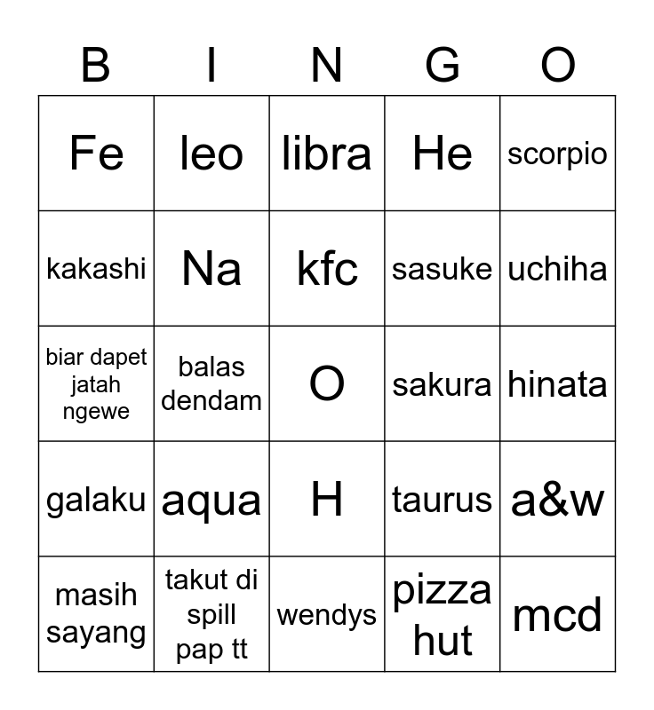 This bingo card has a free space and 24 words: aqua, takut di spill pap tt, kfc, masih sayang, scorpio, Fe, kakashi, leo, sakura, H, sasuke, biar dapet jatah ngewe, taurus, a&w, Na, pizza hut, hinata, libra, uchiha, balas dendam, mcd, galaku, He and wendys.