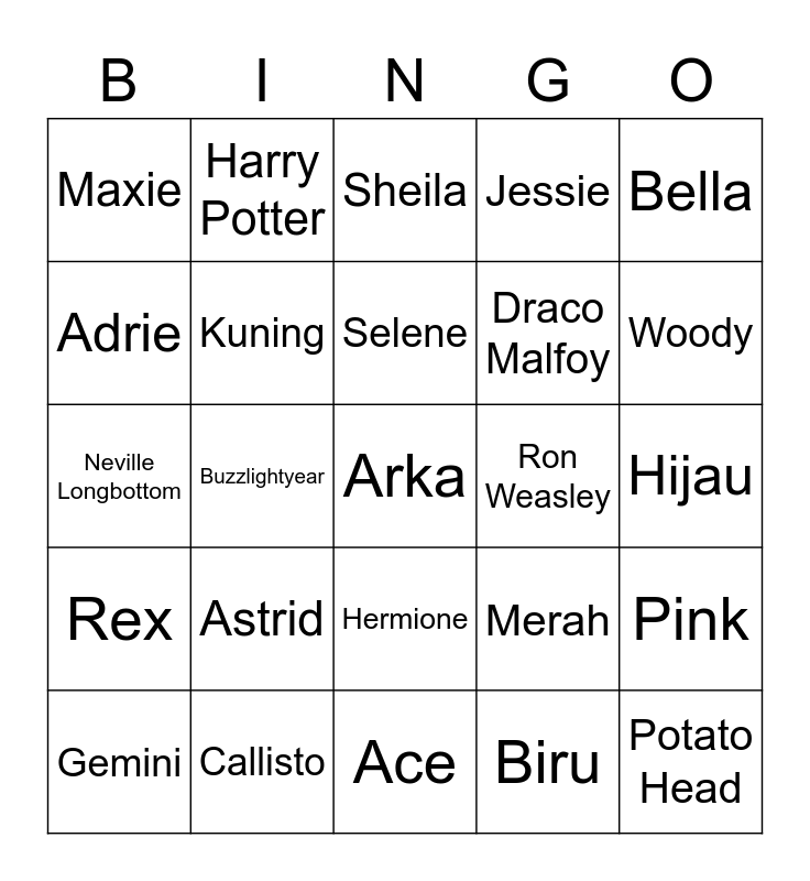 This bingo card has a free space and 24 words: Astrid, Callisto, Selene, Gemini, Bella, Maxie, Adrie, Harry Potter, Ron Weasley, Hermione, Draco Malfoy, Neville Longbottom, Merah, Pink, Kuning, Biru, Hijau, Sheila, Woody, Buzzlightyear, Potato Head, Rex, Jessie and Ace.