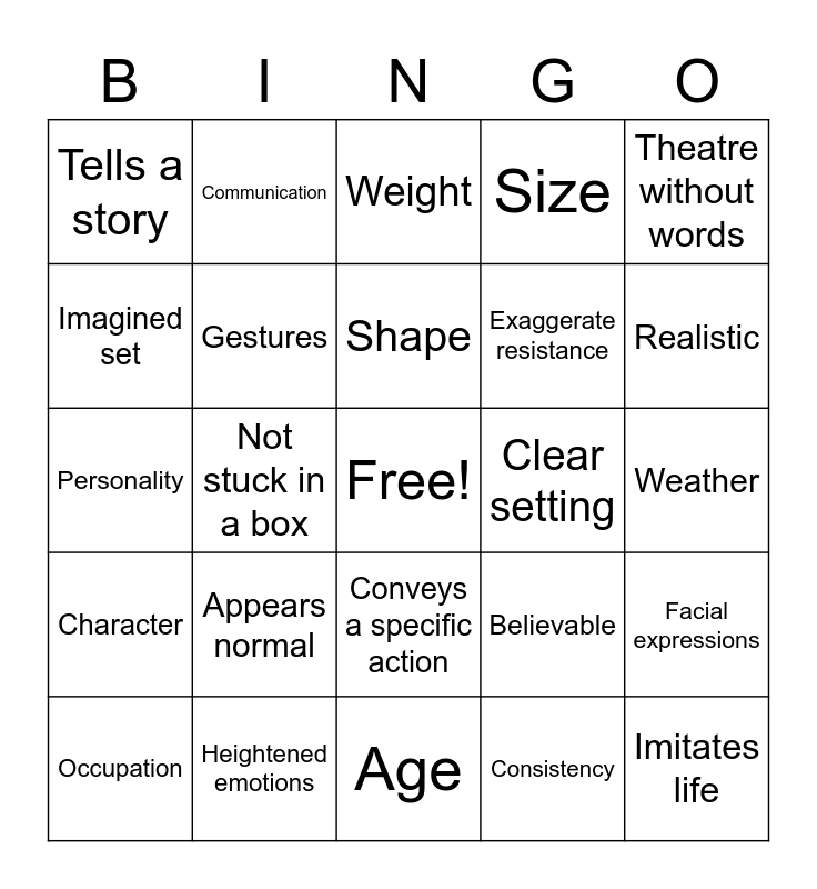 This bingo card has a free space and 28 words: Facial expressions, Imagined props, Exaggerate resistance, Consistency, Imagined set, Weight, Communication, Character, Clear setting, Occupation, Personality, Size, Heightened emotions, Age, Realistic, Attitude, Appears normal, Gestures, Shape, Conveys a specific action, Tells a story, Status, Imitates life, Not stuck in a box, Weather, Believable, Theatre without words and Used every day.