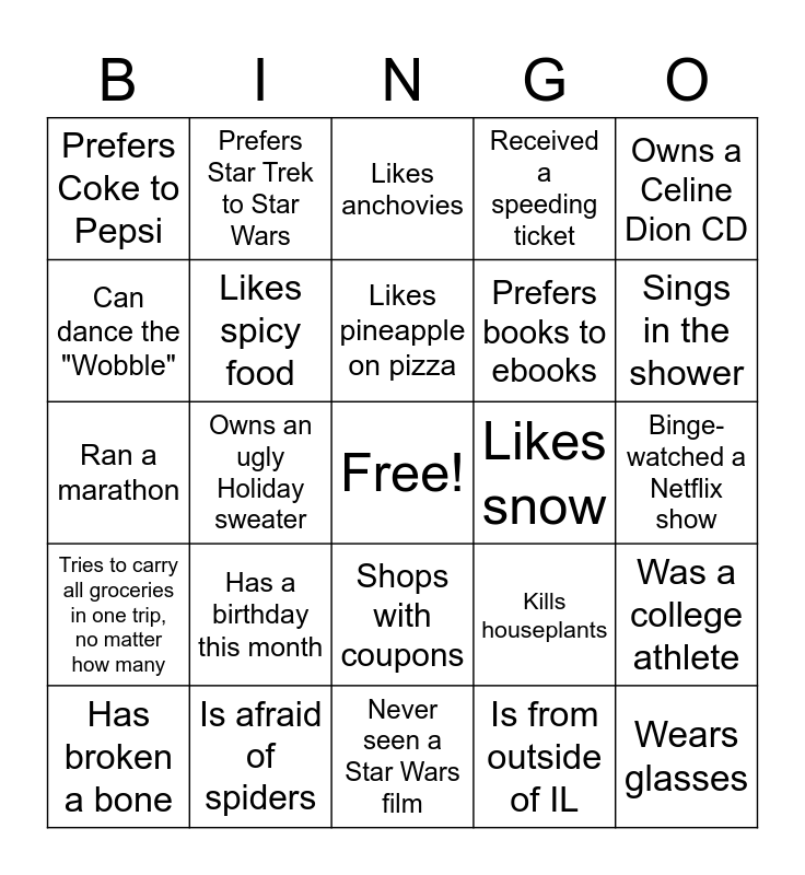 This bingo card has a free space and 95 words: Is a cat person, Is a dog person, Is from outside of IL, Can dance the salsa, Doesn't drink coffee, Flosses teeth twice daily, Has a tattoo, Is afraid of spiders, Is left-handed, Is an only child, Is younger than you, Is older than you, Can touch their toes, Likes pineapple on pizza, Is bilingual, Prefers Coke to Pepsi, Sings in the shower, Plays a musical instrument, Has never had a cavity, Is taller than you, Is shorter than you, Takes the bus/train to UIC, Is right-handed, Has been sledding, Received a speeding ticket, Can dance the "Wobble", Has a pet other than dog/cat, Prefers books to ebooks, Has been hiking, Has been skydiving, Has a birthday this month, Made and kept a New Year's resolution, Checks Facebook daily, Had braces, Has broken a bone, Never broken a bone, Never seen a Star Wars film, Loves Karaoke, Ran a marathon, Ridden a motorcycle, Was a college athlete, Owns an ugly Holiday sweater, Shops with coupons, Owns a Celine Dion CD, Kills houseplants, Likes snow, Can bake a cake from scratch, Has had a snowball fight, Is a night owl, Is afraid of heights, Has been bungee jumping, Has watched 'Titanic' more than once, Follows the rules when playing Monopoly, Has Justin Bieber on their playlist, Plays video games, Can do a handstand, Made a snowman as an adult, Is wearing red, Has changed a flat tire, Has been surfing, Likes spicy food, Has never used a rotary dial phone, Still has a VCR and VHS tapes, Is wearing ornaments as earrings, Prefers Pepsi to Coke, Doesn't drink soda, Drinks more than 3 cups of coffee a day, Has never listened to an 8-track tape, Likes anchovies, Can roll their tongue, Is double jointed, Is ticklish, Wears glasses, Wears contacts, Knows a celebrity, Can juggle, Can do "The Worm" dance move, Can touch their tongue to their nose, Routinely wears mismatched socks, Prefers Star Trek to Star Wars, Prefers pie to cake, Has wondered whether chili is a soup or a stew, Prefers oatmeal raisin to chocolate chip cookies, Would rather be a pirate than a ninja, Binge-watched a Netflix show, Tries to carry all groceries in one trip, no matter how many, Dances in the kitchen, Sings in the car, Has popped bubble wrap for fun, Re-reads emails immediately after sending, Has Googled themselves, Talks to their pet(s), Has walked into a room and forgotten why they were there, Likes Disney movies and Sets multiple, sequential alarms to get up in the morning.