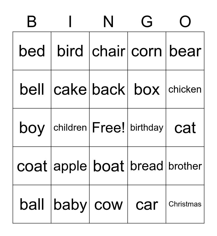This bingo card has a free space and 24 words: apple, baby, back, ball, bear, bed, bell, bird, birthday, boat, box, boy, bread, brother, cake, car, cat, chair, chicken, children, Christmas, coat, corn and cow.
