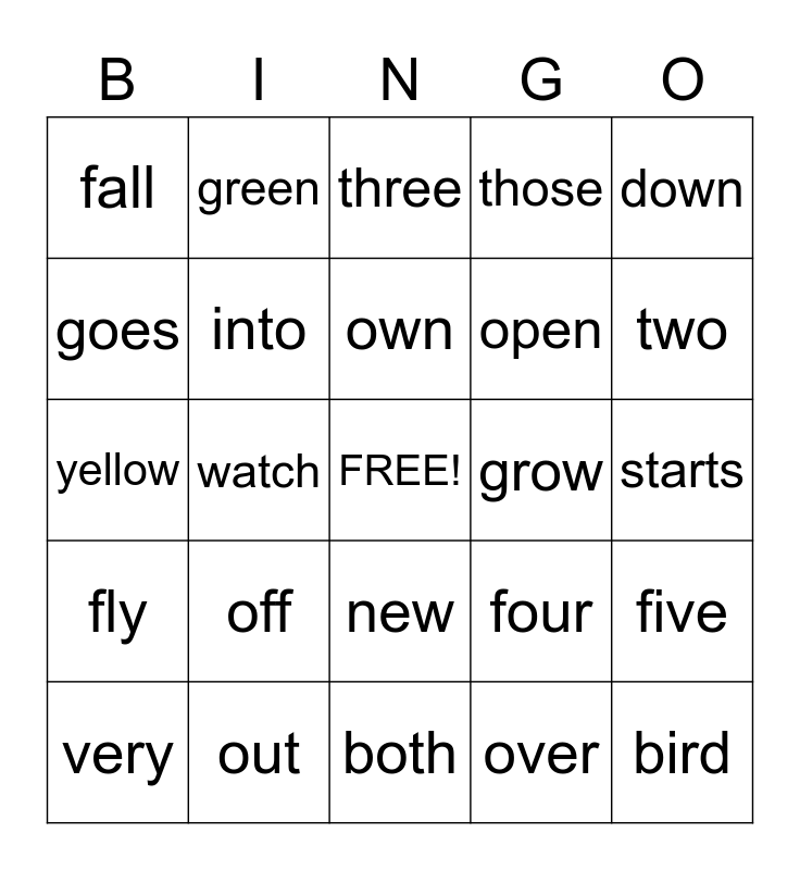 This bingo card has a free space and 24 words: off, out, own, very, down, fall, goes, green, grow, new, open, yellow, four, five, into, over, starts, three, two, watch, bird, fly, those and both.