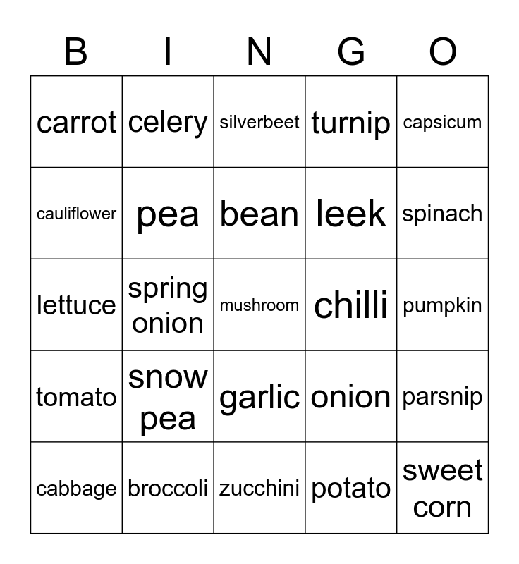 This bingo card has a free space and 24 words: snow pea, broccoli, bean, cabbage, capsicum, carrot, cauliflower, celery, chilli, garlic, leek, lettuce, onion, parsnip, pea, potato, pumpkin, silverbeet, spinach, spring onion, sweet corn, tomato, turnip and zucchini.