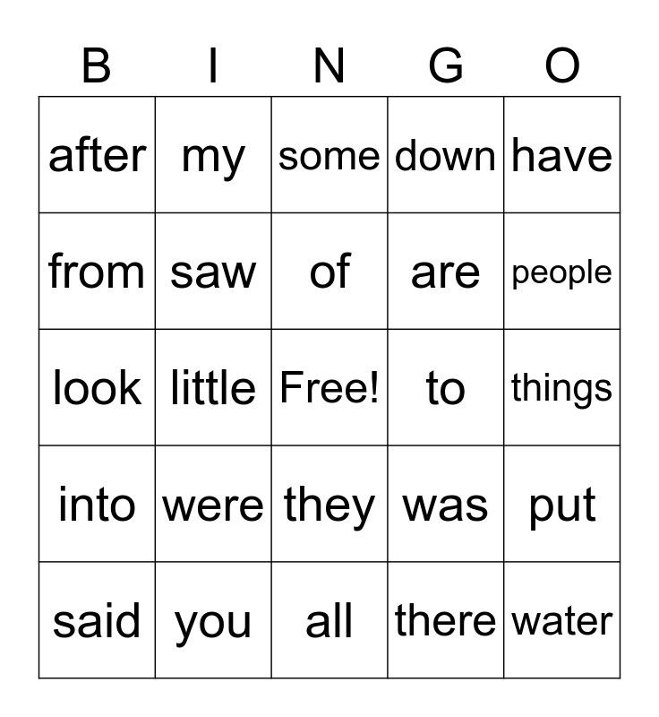 This bingo card has a free space and 24 words: were, you, of, said, have, after, from, my, to, they, are, look, was, put, saw, there, things, some, people, little, water, into, down and all.