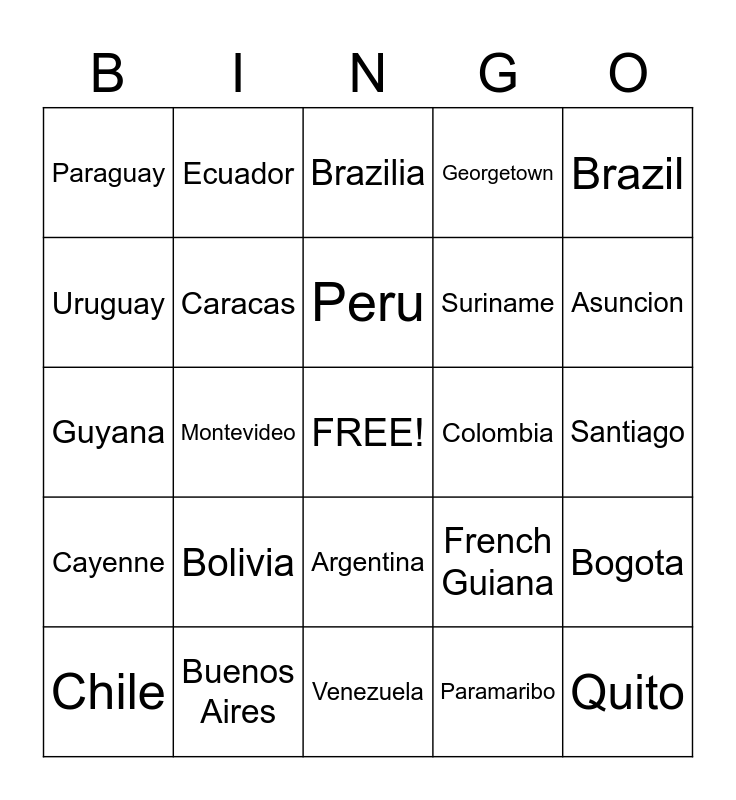 This bingo card has a free space and 25 words: Bolivia, Venezuela, Peru, Chile, Brazil, Paraguay, Uruguay, Ecuador, Colombia, Argentina, Suriname, Guyana, French Guiana, Bogota, Caracas, Lima, Santiago, Brazilia, Asuncion, Montevideo, Quito, Buenos Aires, Cayenne, Georgetown and Paramaribo.
