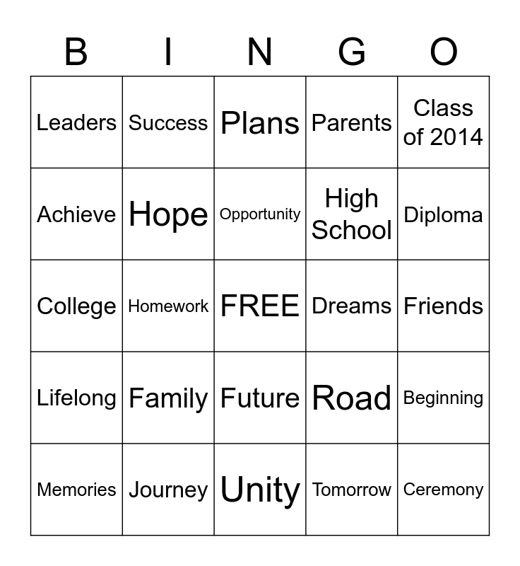 This bingo card has a free space and 24 words: Family, Journey, Opportunity, Memories, Class of 2014, Leaders, Achieve, Success, Dreams, Future, High School, College, Road, Beginning, Hope, Tomorrow, Friends, Plans, Diploma, Homework, Ceremony, Lifelong, Parents and Unity.