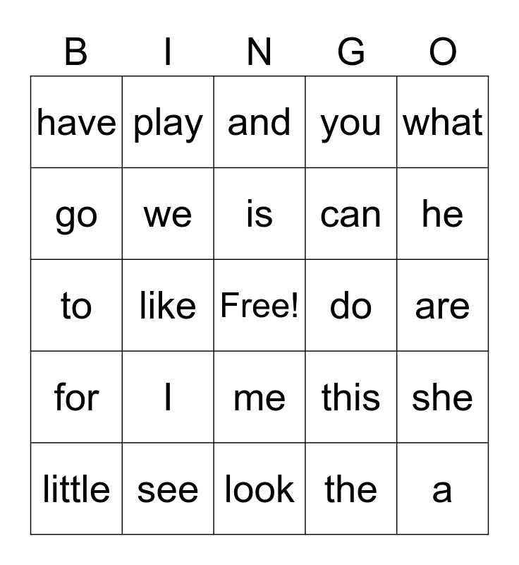This bingo card has a free space and 24 words: I, see, is, little, what, have, go, play, do, me, can, to, this, she, we, the, are, and, he, like, a, for, you and look.