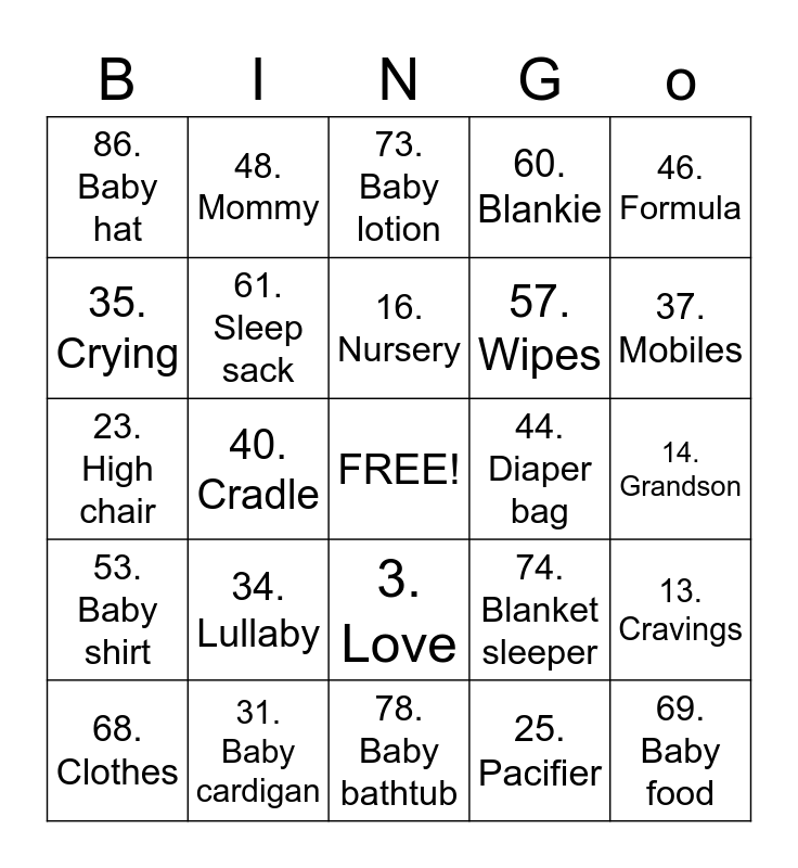 This bingo card has a free space and 87 words: 1. Sippy cup, 2. Baby walker, 3. Love, 4. Diapers, 5. Baby shampoo, 6. Wash cloth, 7. Pink, 8. Ultrasound, 9. Baby carrier, 10. Mittens, 11. Name, 12. Nursery rhyme, 13. Cravings, 14. Grandson, 15. Girl, 16. Nursery, 17. Bath time, 18. Toddler, 19. Baby powder, 20. Blue, 21. Booties, 22. Hooded towel, 23. High chair, 24. Baby socks, 25. Pacifier, 26. Moses basket, 27. Layette, 28. Teether, 29. Granddaugther, 30. Burp cloth, 31. Baby cardigan, 32. Onesie, 33. Carrycot, 34. Lullaby, 35. Crying, 36. Colic, 37. Mobiles, 38. Stork, 39. Security blanket, 40. Cradle, 41. Gifts, 42. Milk, 43. Baby, 44. Diaper bag, 45. Stuffed doll, 46. Formula, 47. Towel, 48. Mommy, 49. Newborn, 50. Baby book, 51. Play gym, 52. Bottle, 53. Baby shirt, 54. Rattle, 55. Diaper pins, 56. Playpen, 57. Wipes, 58. Bib, 59. Gerber, 60. Blankie, 61. Sleep sack, 62. Nap time, 63. Teething ring, 64. Boy, 65. Playsuit, 66. Rubber duck, 67. Baby sling, 68. Clothes, 69. Baby food, 70. Giggles, 71. Family, 72. Baby monitor, 73. Baby lotion, 74. Blanket sleeper, 75. Baby swing, 76. Toy box, 77. Bassinet, 78. Baby bathtub, 79. Stroller, 80. Pram suit, 81. Grandchild, 82. Cot, 83. Teddy bear, 84. Bonnet, 85. Bouncy seat, 86. Baby hat and 87. Blankets.