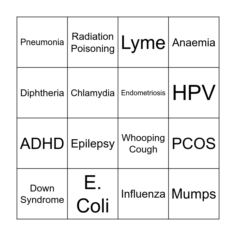 This bingo card has 64 words: Free!, Malaria, Tetanus, Influenza, Covid, Plague, Radiation Poisoning, Denge Fever, HPV, Chicken pox, E. Coli, Salmonella, HIV, Diphtheria, Measles, Lyme, Mumps, Pneumonia, Rubella, Whooping Cough, Tuberculosis, Shingles, Chlamydia, Herpes, Asthma, Dementia, Diabetes, Lupus, Cystic Fibrosis, Autism, Depression, Anxiety, Arthritis, Crohn's, Epilepsy, Haemophilia, Insomnia, Sickle Cell, Tourettes, Endometriosis, PCOS, Down Syndrome, Lymphoma, Lukeimia, Cerebral Palsy, ADHD, Multiple Sclerosis, Coeliac, Aneurysm, Scarlet Fever, Addison's, Huntington's Chorea, Bronchitis, Bulimia, Anorexia, Anthrax, Anaemia, Laryngitis, Meningitis, Meningococcal, Norovirus, Osteoporosis, Parkinson's and Scoliosis.