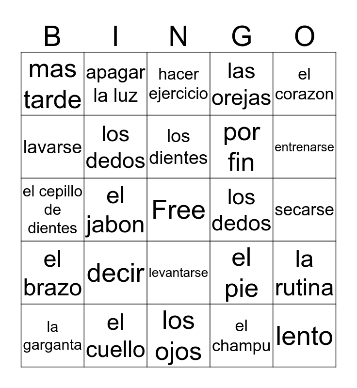 This bingo card has a free space and 24 words: decir, el cuello, los dientes, la garganta, el corazon, mas tarde, lavarse, apagar la luz, los dedos, levantarse, por fin, el cepillo de dientes, el pie, la rutina, los dedos, el champu, secarse, hacer ejercicio, entrenarse, el jabon, lento, el brazo, las orejas and los ojos.